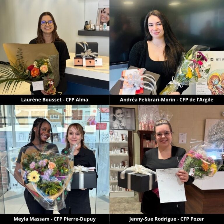 Les récipiendaires des bourses d’études en esthétique Epiderma 2025 sont LAURÈNE BOUSSET (CFP Alma), ANDRÉA FEBBRARI-MORIN (CFP de l’Argile à Joliette), MEYLA MASSAM (CFP Pierre-Dupuy à Longueuil) et JENNY-SUE RODRIGUE (CFP Pozer à Saint-Georges).
